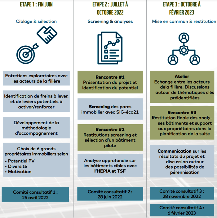 La phase 1 de Genèvoltaïque+ a été réalisée de janvier 2022 à février 2023 avec l’accompagnement de 6 propriétaires et régies, une analyse de faisabilité pour 7 bâtiments, le développement de la méthode d’activation, 3 fiches conseils et une analyse des freins et de leviers d’action pour massifier les installations photovoltaïques et biosolaires (énergie + végétalisation) à Genève. Avec 100% des acteurs suivis ayant lancé des démarches internes de validation avec le propriétaire ou la direction interne, la perspective est une réalisation d’environ 800 kWc de production photovoltaïque à terme, sur la base de ce pilote. Ce premier pas a lancé la réflexion sur une suite.